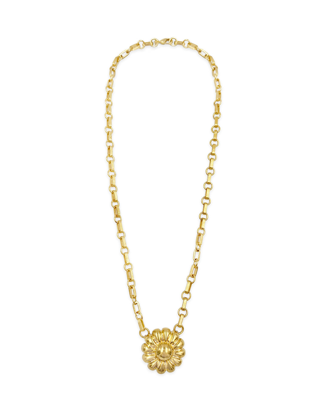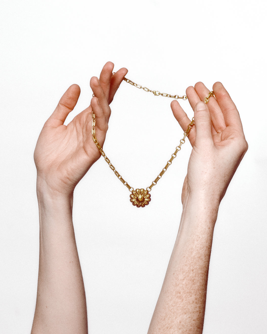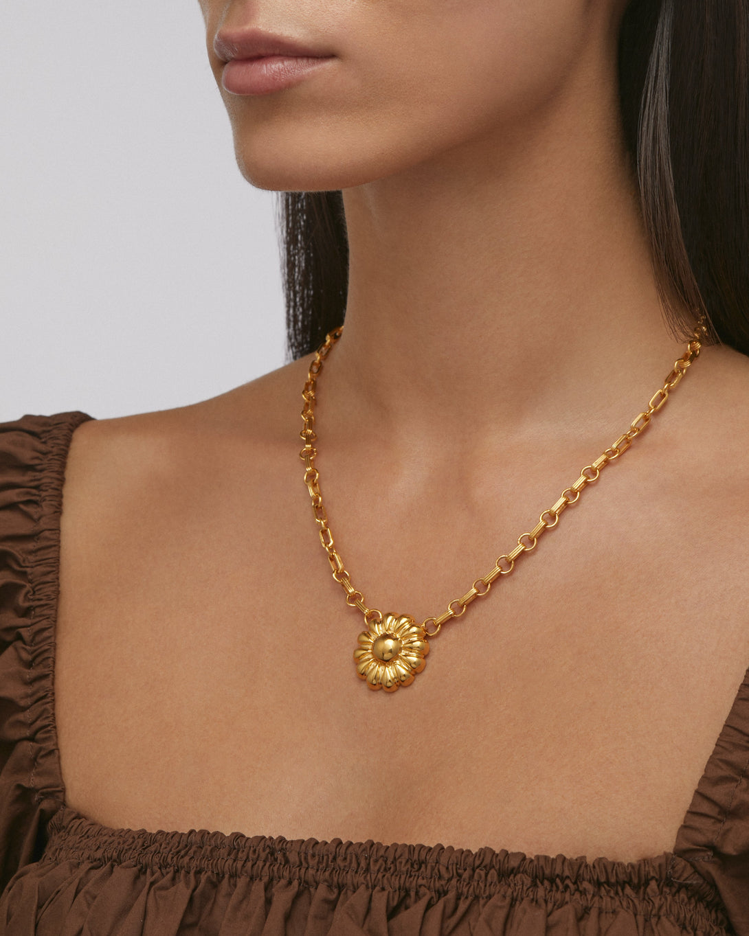 At the heart of our new SS24 collection, our statement Margarita necklace is cast in 18kt gold-plated brass with a hollow interior for a lightweight and comfortable feel. It complements high necklines, sweetheart necklines—all the necklines.